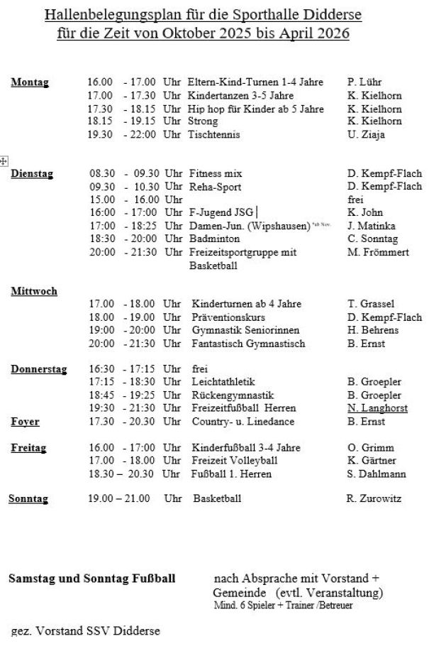 nach Absprache mit der Gemeine Didderse können ab den 9. April 2021 einzelne Familien von Freitag bis Sonntag in der Zeit von 10.00 - 18.00 Uhr für 60 Minuten die Sporthalle buchen. Ein aufgebauter Parcour ist vorhanden. Danach müssen die Geräte und Oberflächen von der Familie desinfiziert werden. Desinfektionsmittel steht zur Verfügung und es muss gelüftet werden. Zur Belüftung sind zwischen zwei Terminen 60 Minuten einzuhalten. Die Umkleidekabine wie auch die Duschen dürfen nicht benutzt werden, die Toiletten nur im Ausnahmefall. Die Buchung, mit namentlicher Angabe der Teilnehmer, erfolgt nur